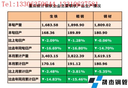 2月24日訊,2月中旬,重點統(tǒng)計鋼鐵企業(yè)共生產(chǎn)粗鋼1898.9萬噸、生鐵1683.58萬噸、精密鋼管1809.02萬噸。其中,粗鋼日產(chǎn)189.89萬噸,環(huán)比下降1.28%;生鐵日產(chǎn)168.36萬噸,環(huán)比下降2.09%;精密鋼管日產(chǎn)180.9萬噸,環(huán)比下降0.06%。精密鋼管庫存量1690.35萬噸,比上一旬增加4.95萬噸,增長0.29%;比去年同期減少64.38萬噸,下降3.67%。
